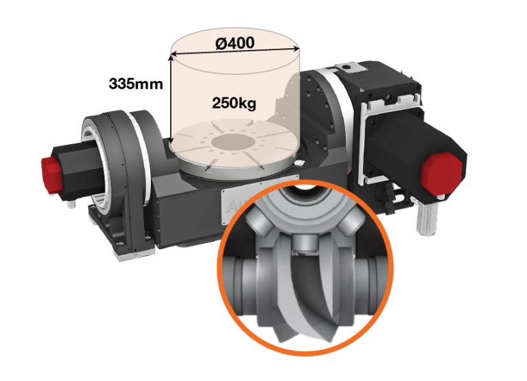 - Integrovaný otočně-sklopný stůl umožňuje simultánní řízení pěti os. Přímé pohony rotačních os zajišťují plynulý chod, vysokou přesnost polohování a opakovatelnost při výrobě složitých tvarů, forem a přesných mechanických dílců.