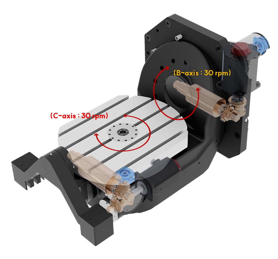 - Integrovaný otočně-sklopný stůl umožňuje simultánní řízení pěti os. Přímé pohony rotačních os zajišťují plynulý chod, vysokou přesnost polohování a opakovatelnost při výrobě složitých tvarů, forem a přesných mechanických dílců.