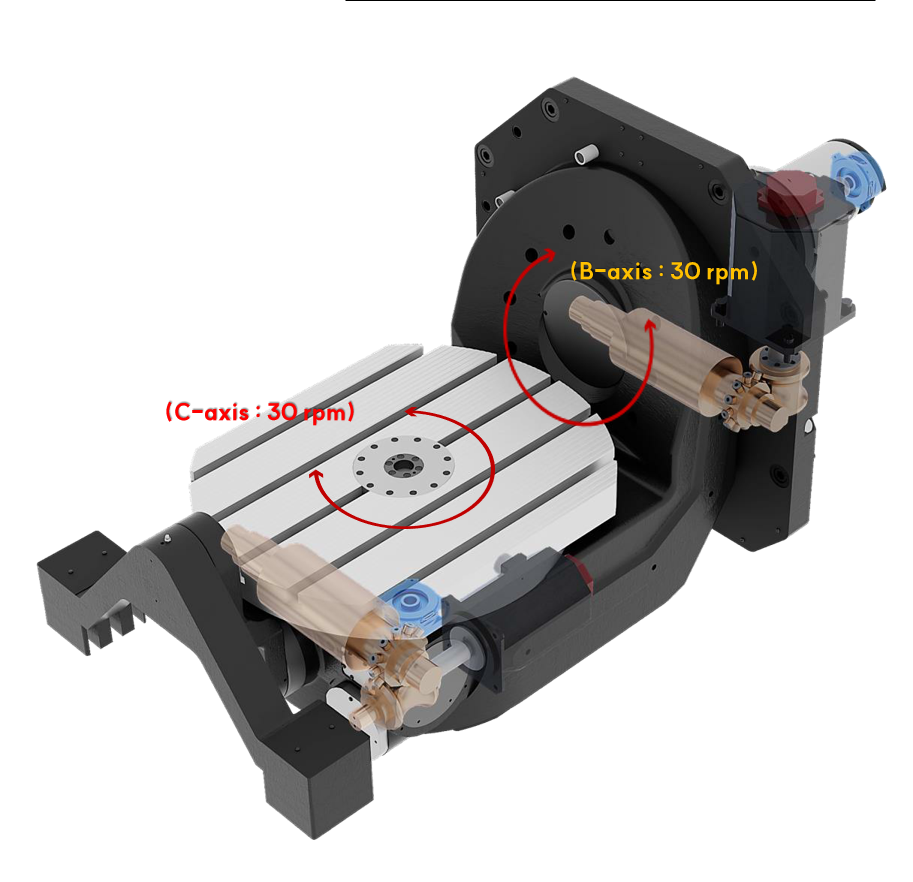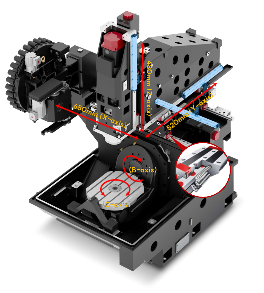 - Stroj je navržen s důrazem na maximální tuhost při zachování kompaktních rozměrů. Masivní základna a optimalizovaná struktura rámu minimalizují vibrace a deformace při náročném třískovém obrábění.