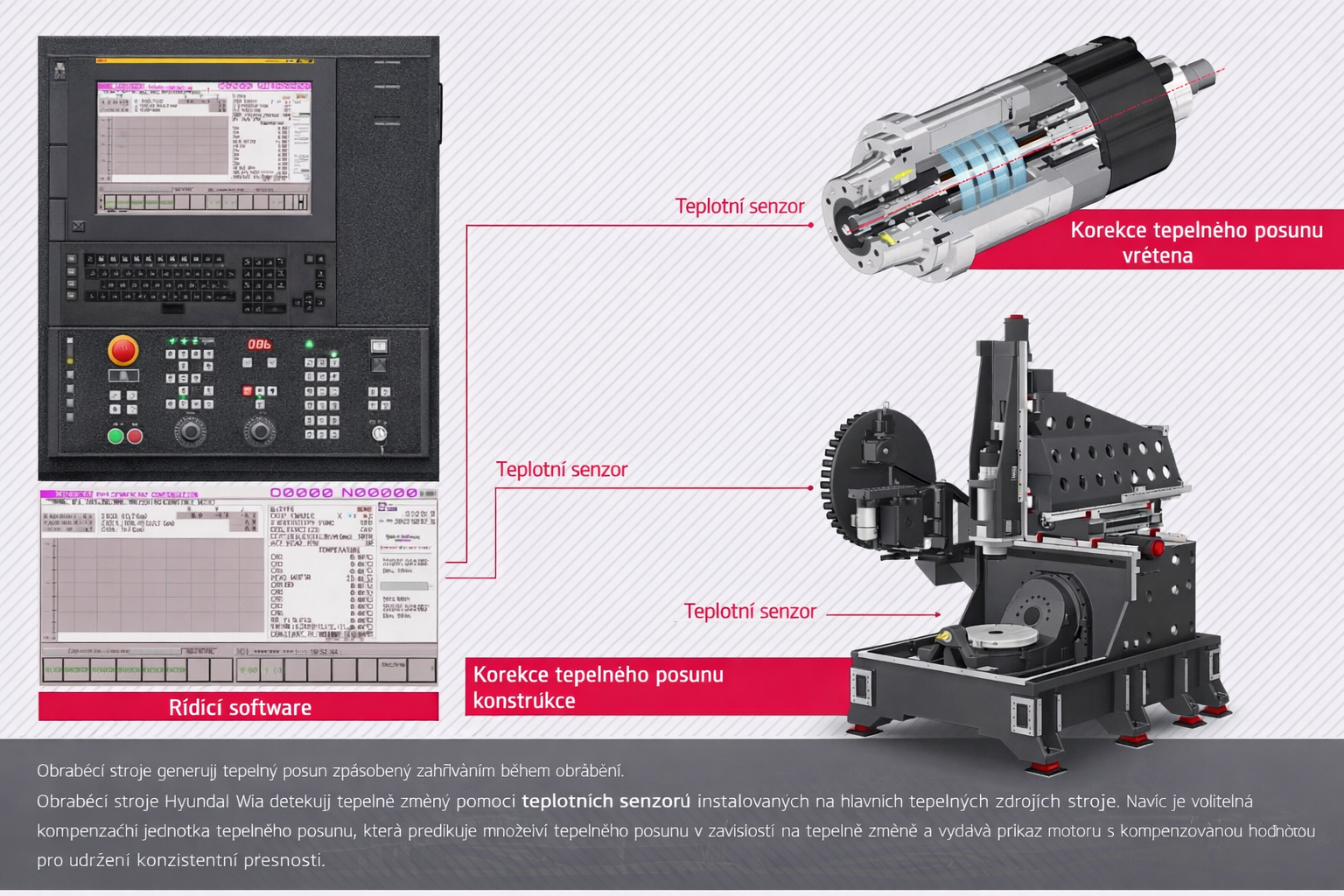 - Stroj je standardně vybaven teplotními senzory na hlavních tepelných zdrojích. Pomocí těchto senzorů a kompenzační jednotky dokáže upravovat pohonové parametry tak, aby byla zaručena maximální přesnost i při různých tepelných podmínkách při obrábění.