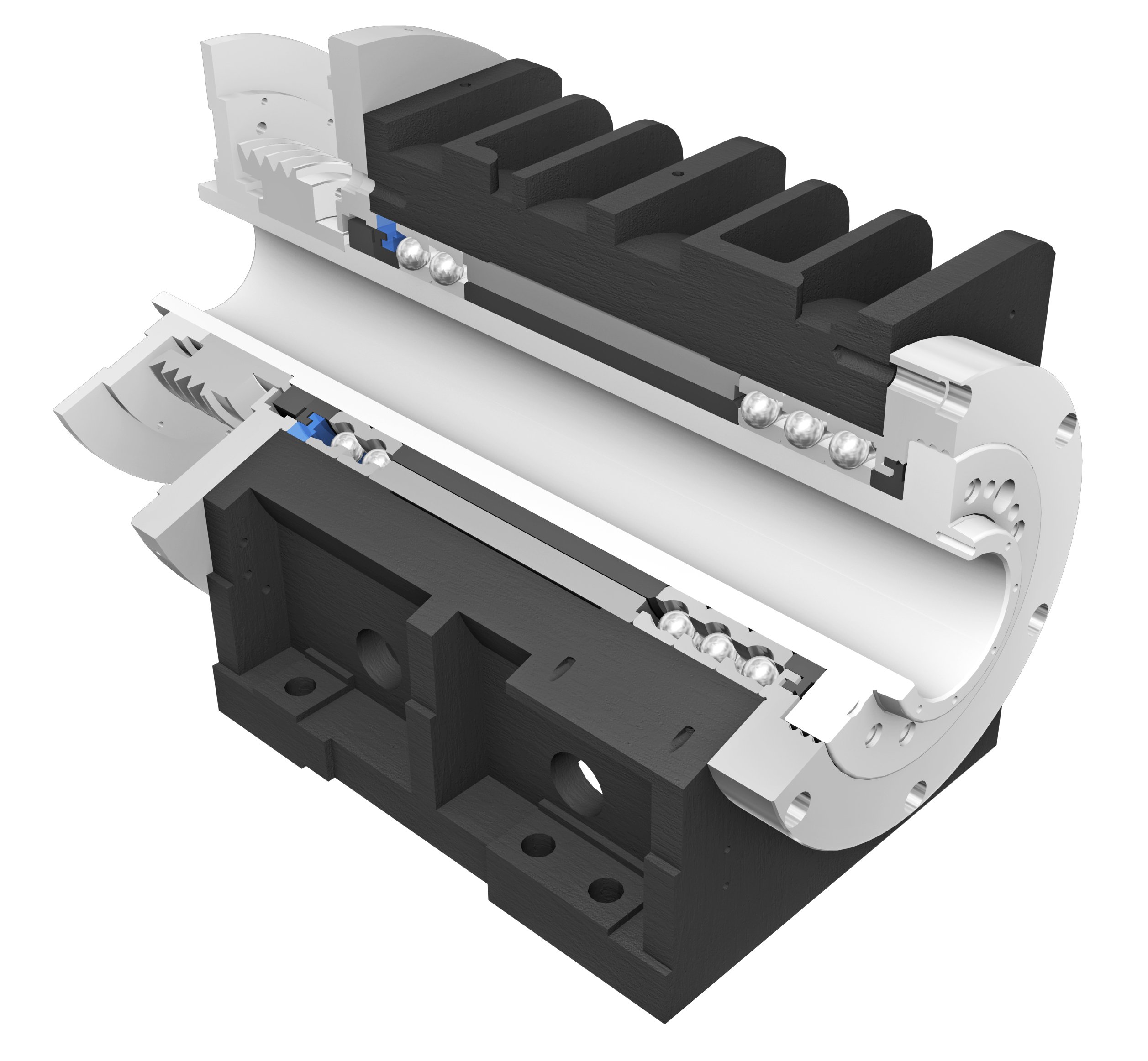 - Uložení vřetena je důležitou součástí konstrukce CNC stroje, která zásadně ovlivňuje jeho přesnost, tuhost a výkon. U soustruhů, jako je L300 série, je použito robustní řešení navržené tak, aby odolávalo silám vznikajícím při velmi těžkém obrábění a zajistilo maximální stabilitu. Konfigurace uložení do přesných dvouřadých ložisek s kosoúhlým stykem zajišťuje extrémní stabilitu i při extrémně velkých úběrech materiálu bez ztráty přesnosti.