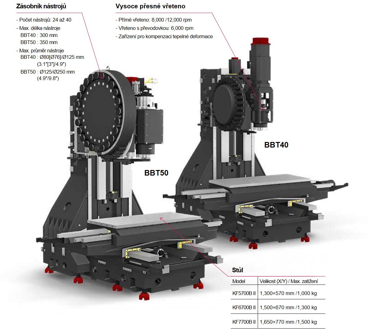- HYUNDAI WIA KF5700B II je osazen vřetenem s kuželem BBT40, který zajišťuje dvojitý kontakt mezi držákem nástroje a vřetenem – kužel i čelo. Tento systém přináší vyšší ohybovou tuhost, stabilní upnutí a delší životnost nástrojů. Vřeteno je navrženo tak, aby bez problémů zvládlo jak lehké dokončovací operace, tak i náročnější odebírání materiálu při vysokých rychlostech.