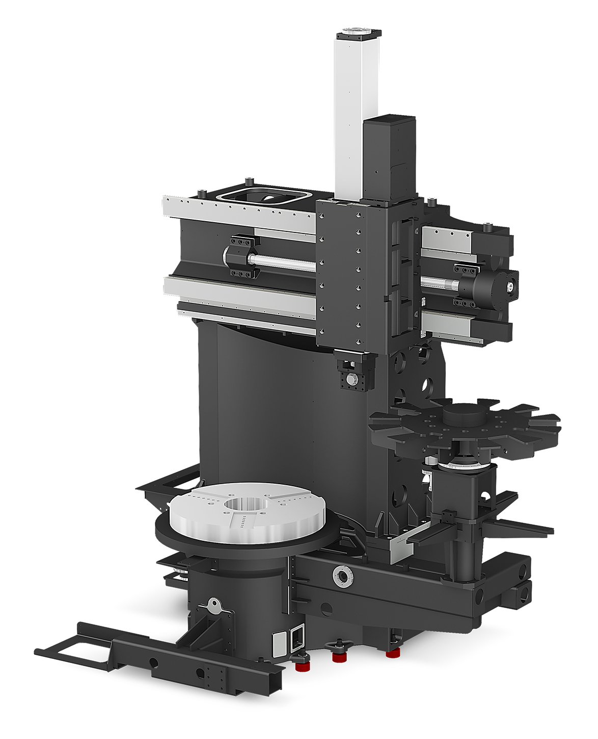 LV4500R je robustní vertikální CNC soustruh navržený pro těžké a přesné obrábění středně velkých obrobků. Stroj je založen na masivním litinovém loži, které zajišťuje vysokou tuhost, stabilitu a účinné tlumení vibrací i při náročných hrubovacích operacích. Konstrukce je optimalizována pro dlouhodobě stabilní přesnost při kontinuálním zatížení. Lineární vedení přispívají k nízkému tření, vysoké dynamice posuvů a dlouhodobé přesnosti při zachování kompaktních rozměrů stroje.