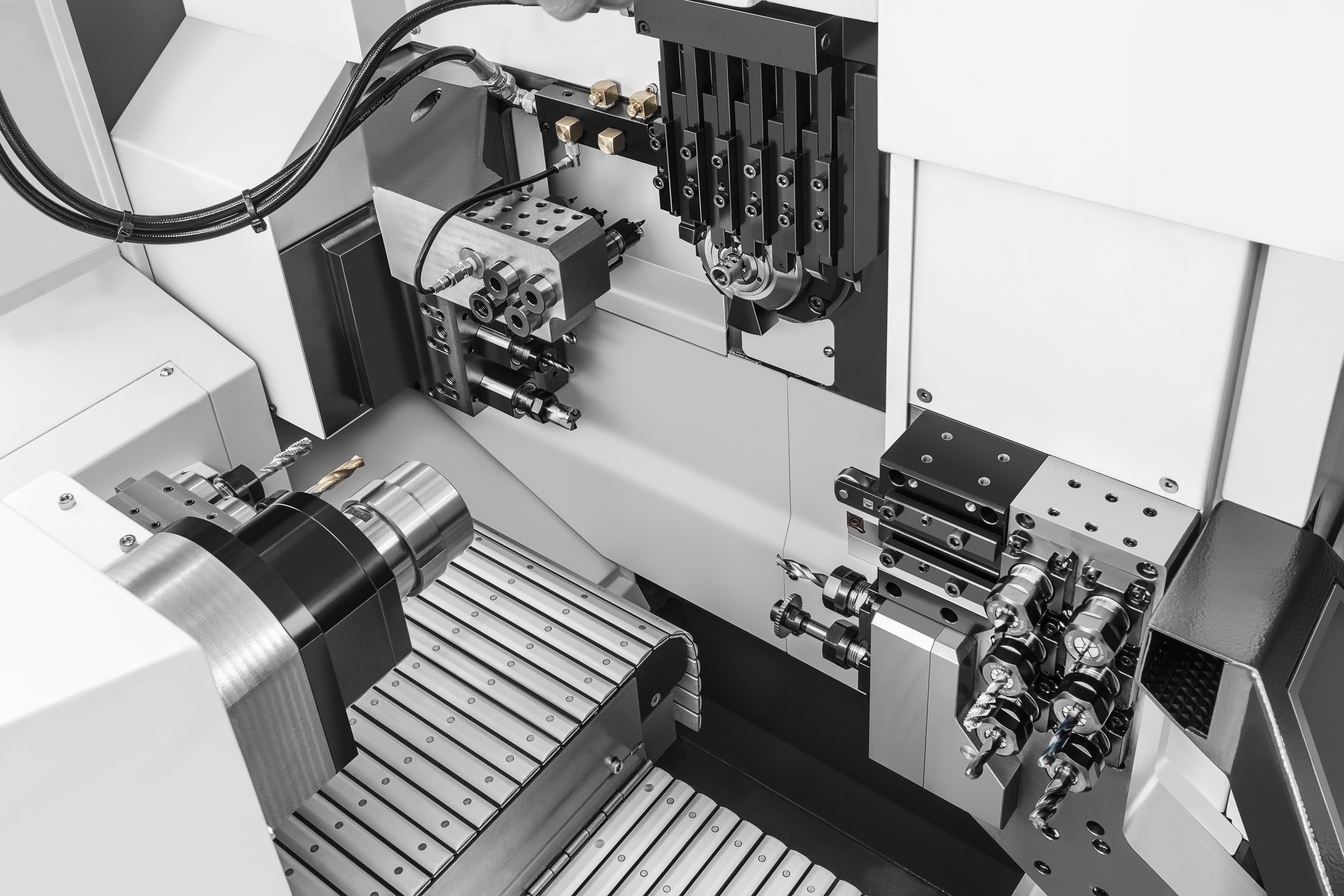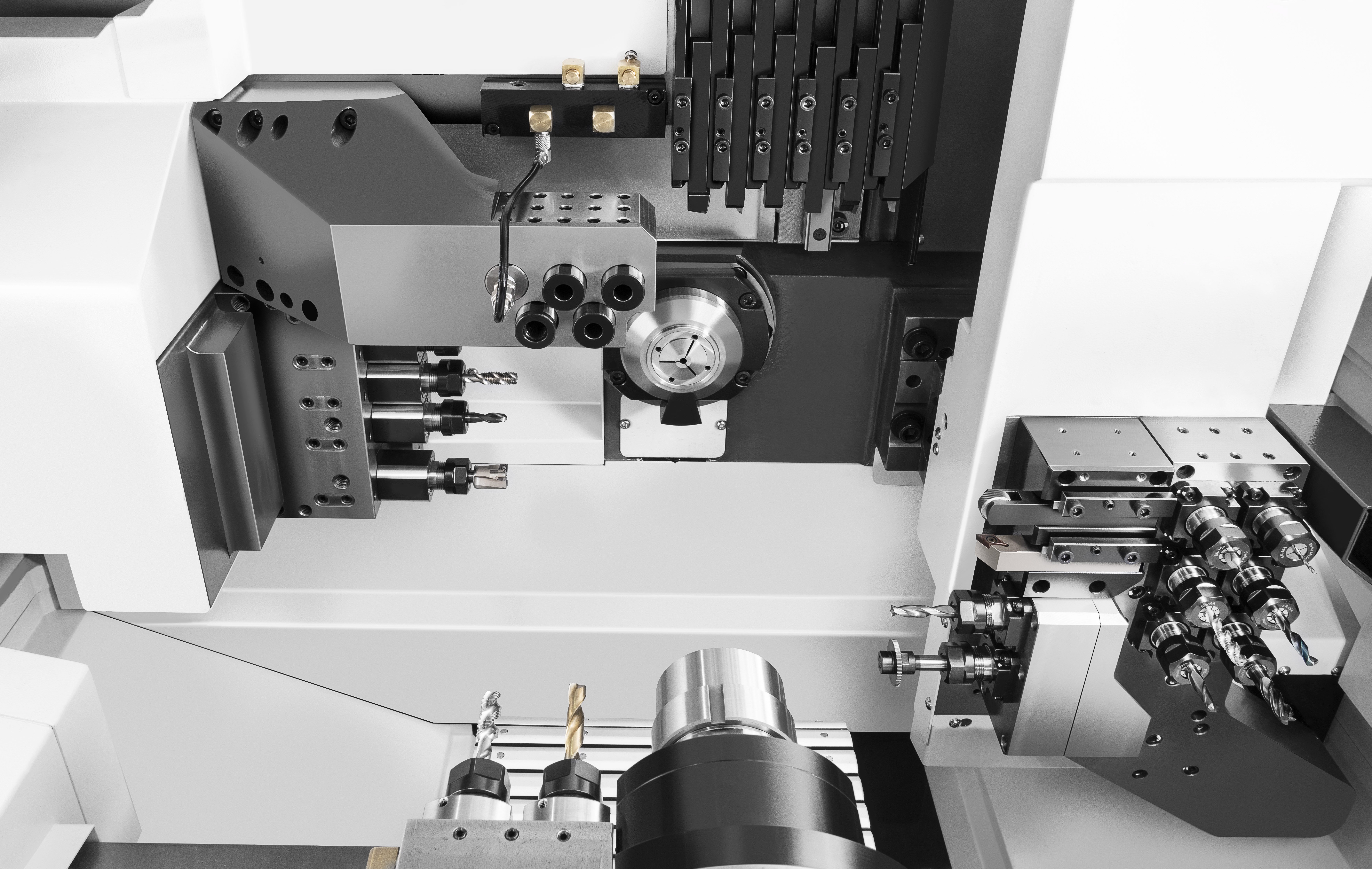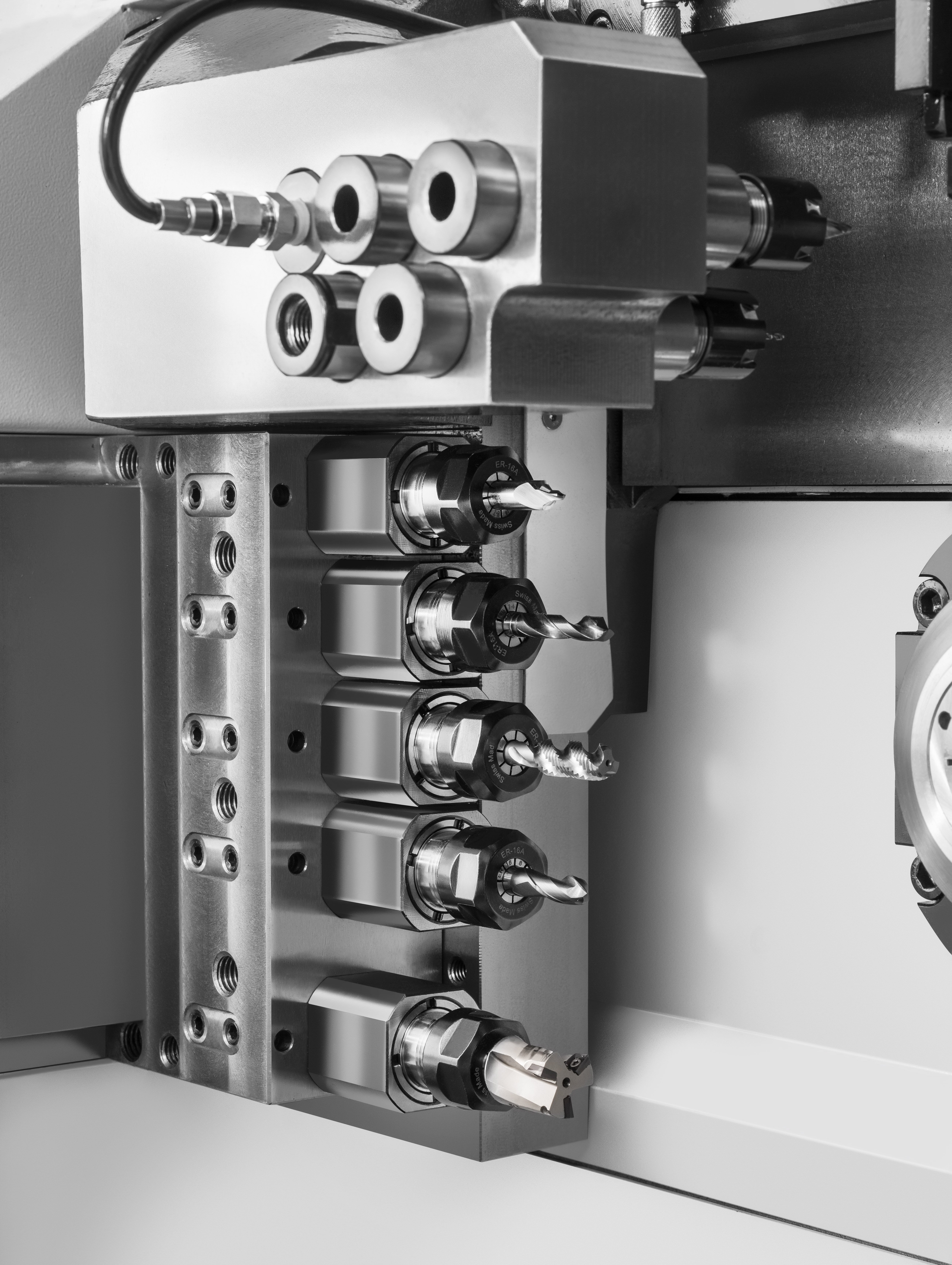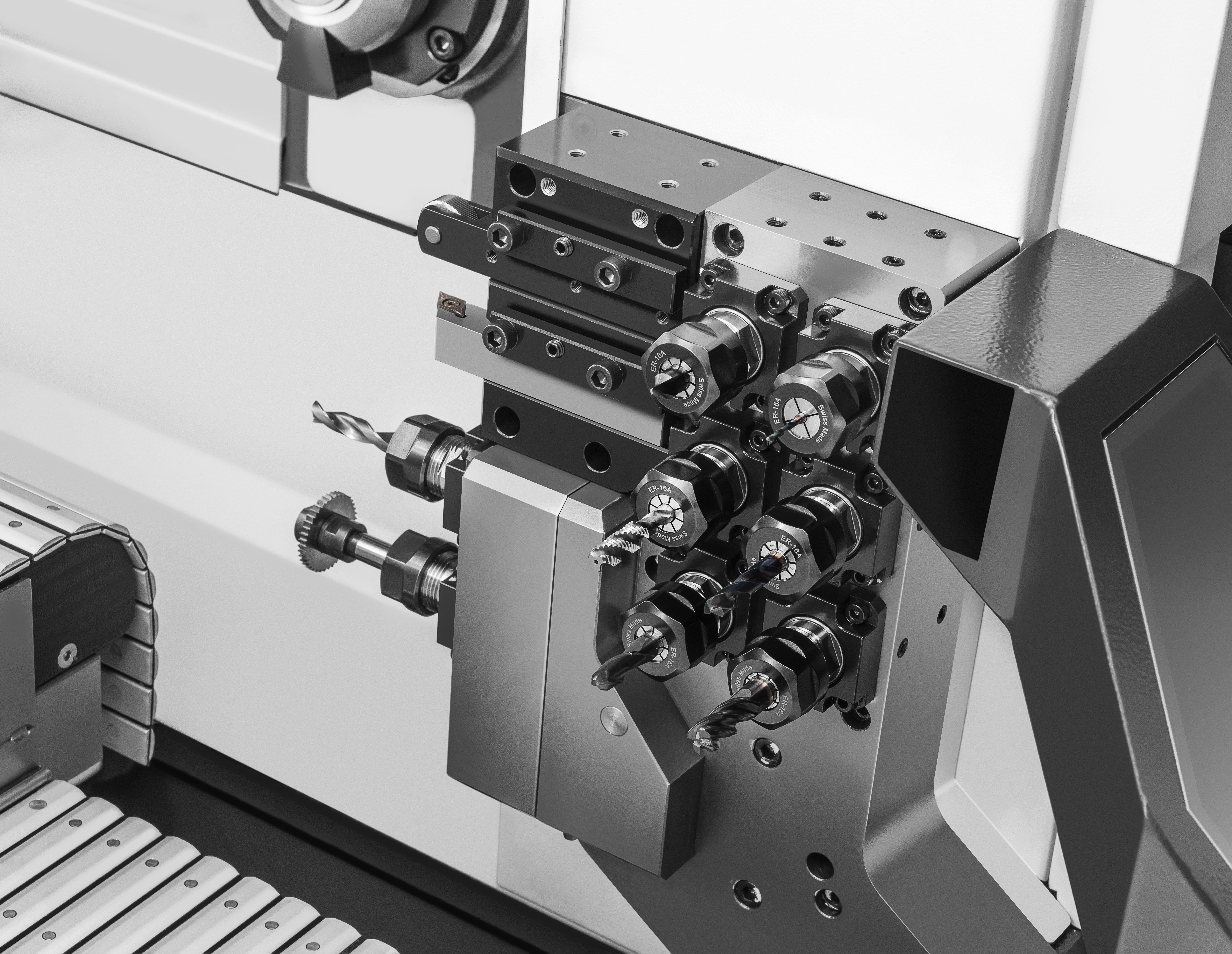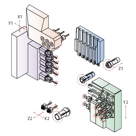 - Optimalizace zadní nástrojové jednotky (osa Y2), kam lze upnout větší počet nástrojů (8-11pozic). Modulární průmyslová převodovka umožňuje využití maximálního krouticího momentu, bez omezení a zvyšuje životnost poháněných nástrojových jednotek.